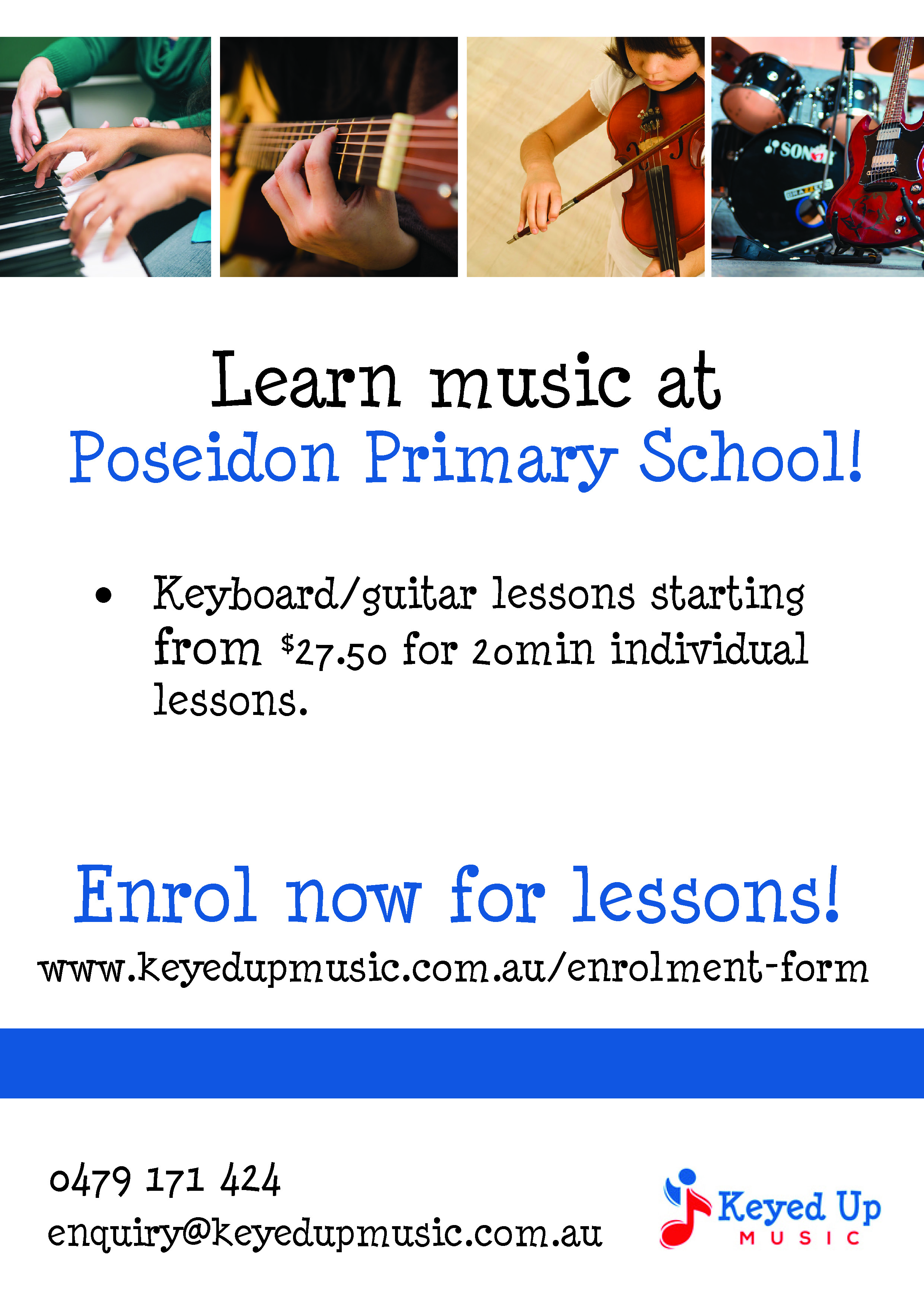 Keyed Up Music teachers deliver lessons at Poseidon Primary School. Please visit https://www.keyedupmusic.com.au/to book and for more information.